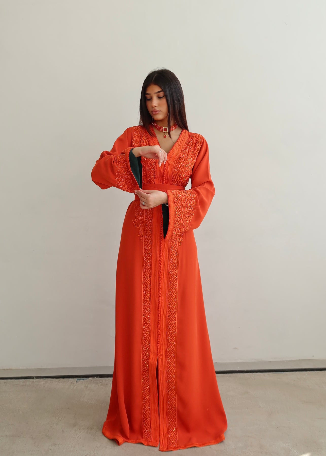 Ein besonderes Highlight ist die breite Sfifa, der dem Look eine dezente Note von Struktur und Stil verleiht. Die Ärmel sind doppelt in einer zweiten Farbe gefüttert – ein raffinierter Akzent, der den Kaftan zu einem wahren Hingucker macht.