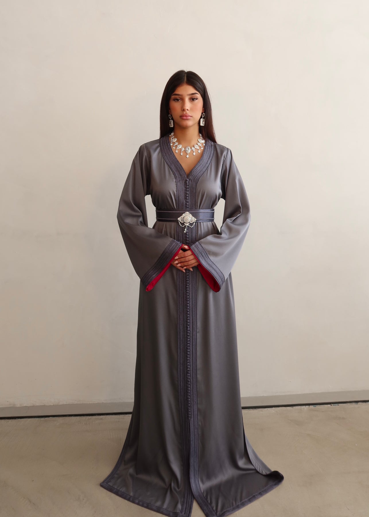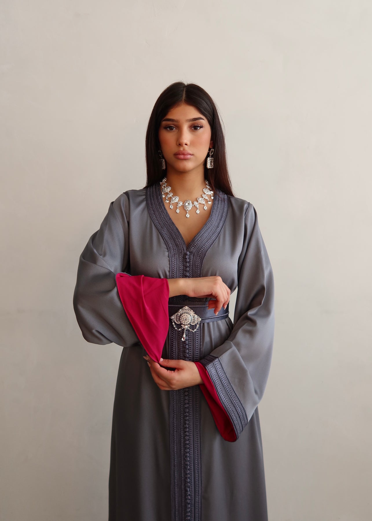 Das Modell ist komplett Ton-in-Ton gehalten und von innen mit einer abgestimmten Fütterung versehen, die dem Kaftan zusätzliche Raffinesse verleiht. Dank seines minimalistischen Stils lässt sich Kaftan Lana vielseitig kombinieren – ob mit auffälligem Statement-Schmuck oder dezenten Accessoires, er passt sich jedem Look mühelos an.