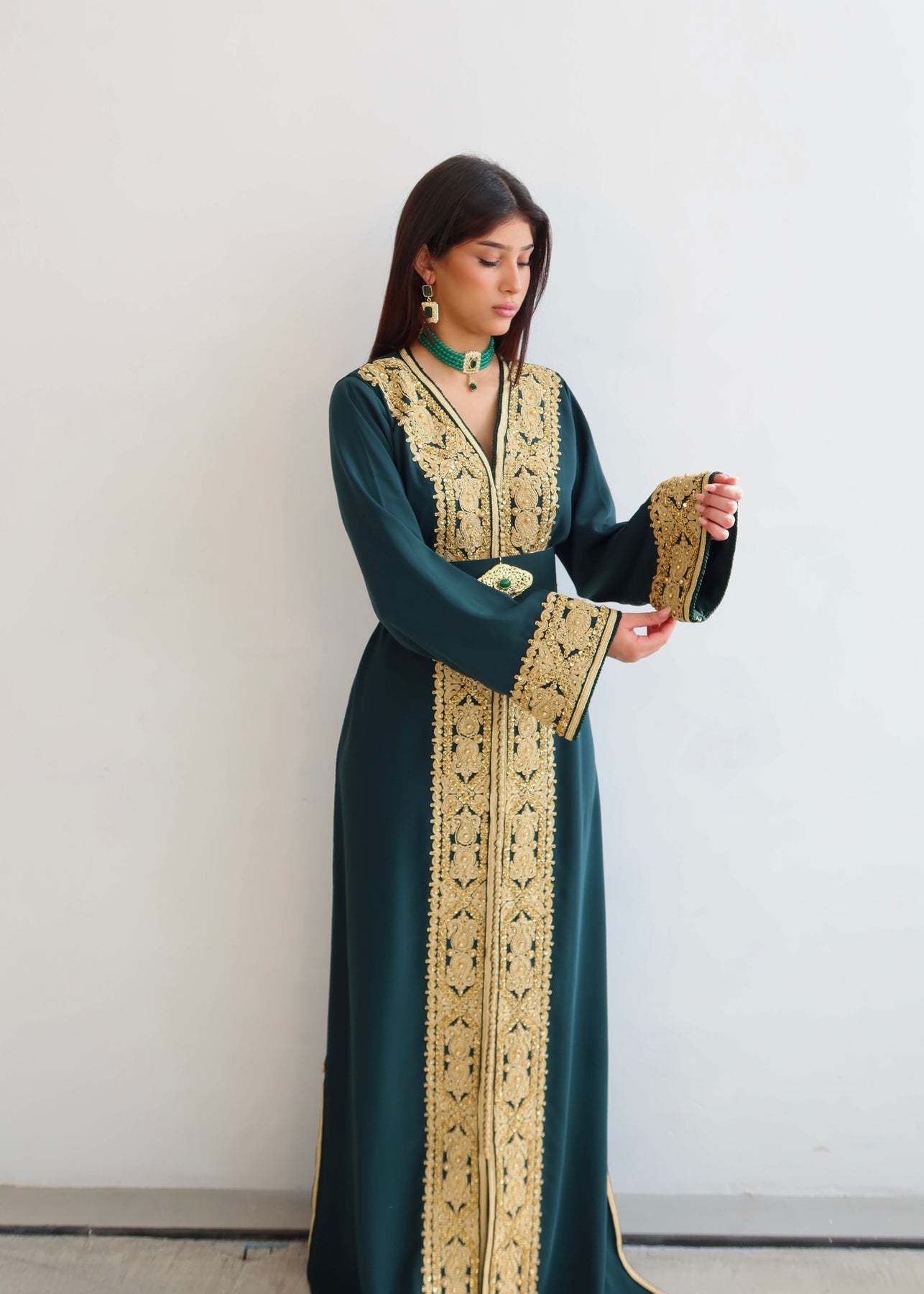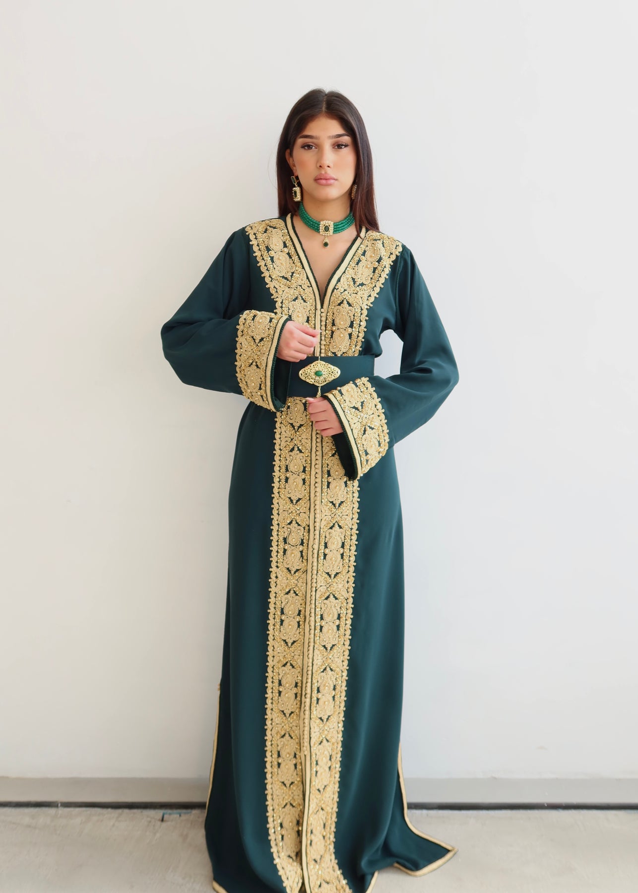 Kaftan Lina ist ein absoluter Blickfang und begeistert mit seiner aufwendigen goldenen Bestickung, die sich über die gesamte Vorderseite und die Ärmel erstreckt. Die edlen Details verleihen dem Design einen prachtvollen und luxuriösen Charakter.