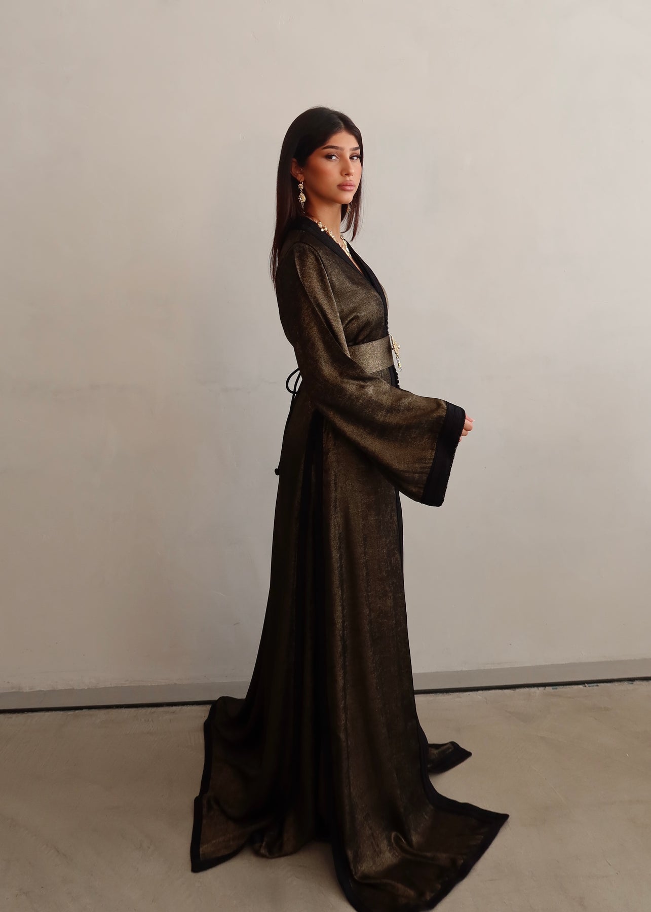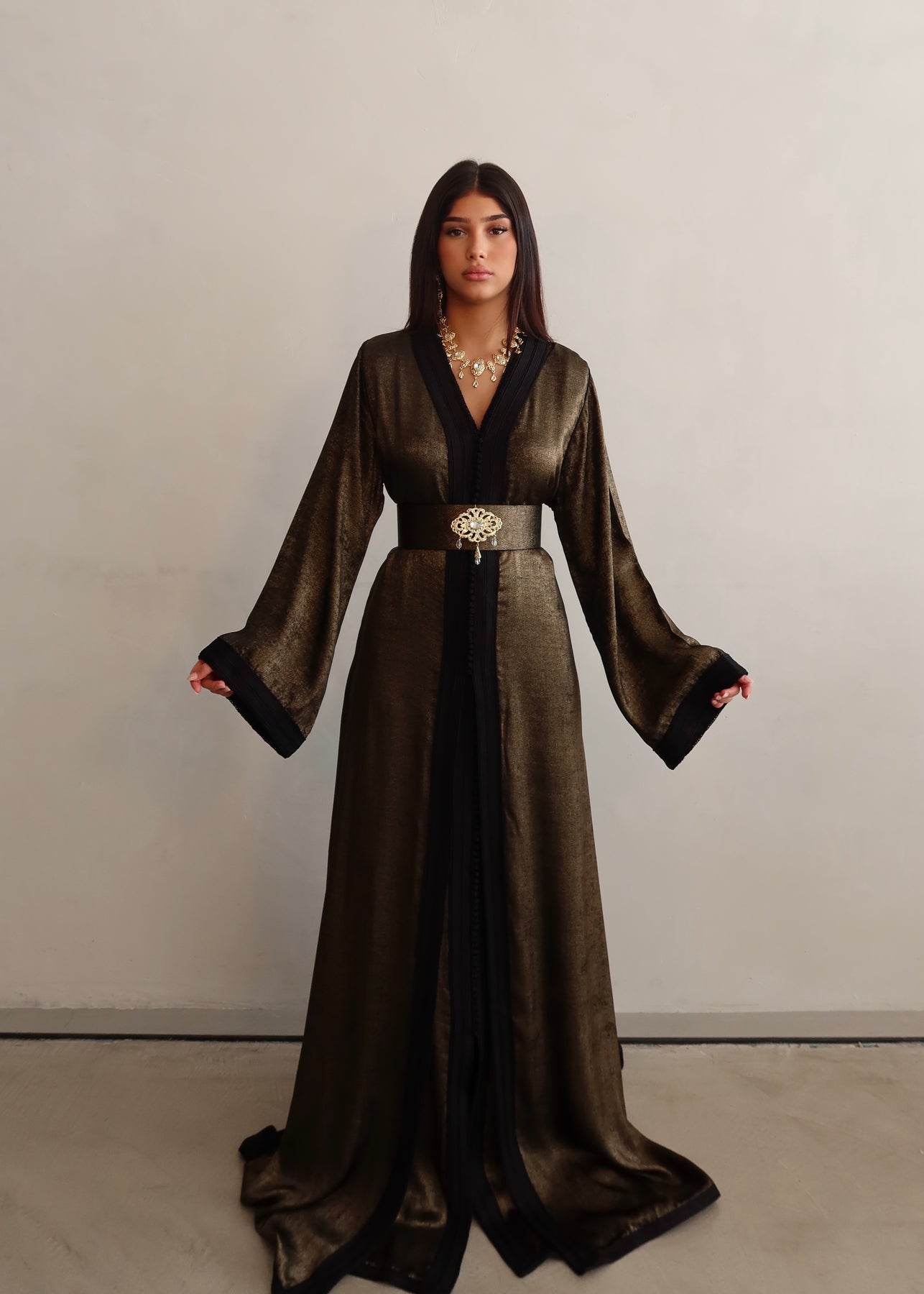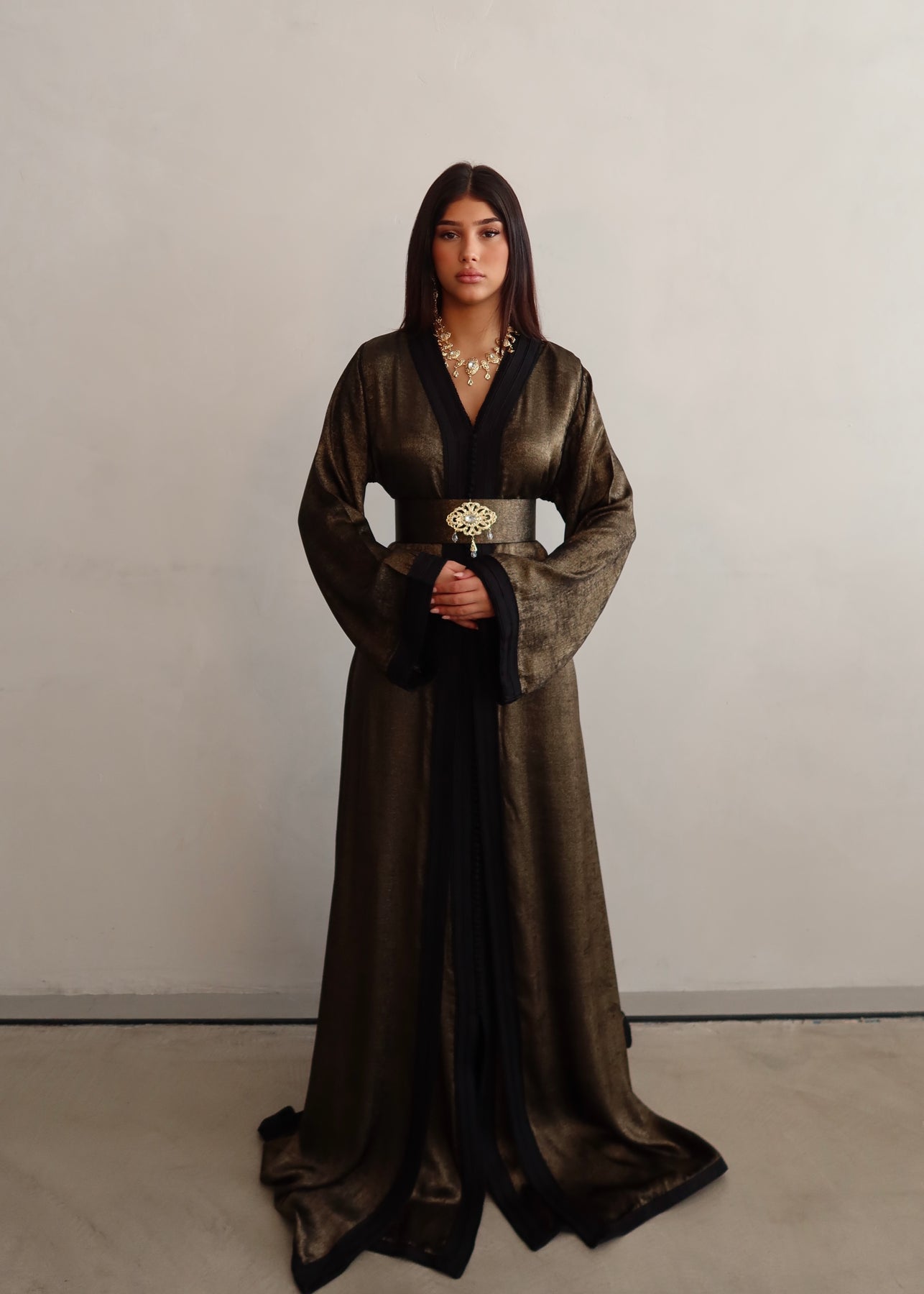 Takshita Amelle besticht durch ihren außergewöhnlichen Stoff, der je nach Lichteinfall wunderschön schimmert und funkelt – ganz ohne Steine oder auffällige Verzierungen. Sie vereint Eleganz und Schlichtheit auf besondere Weise und lässt sich vielseitig stylen.