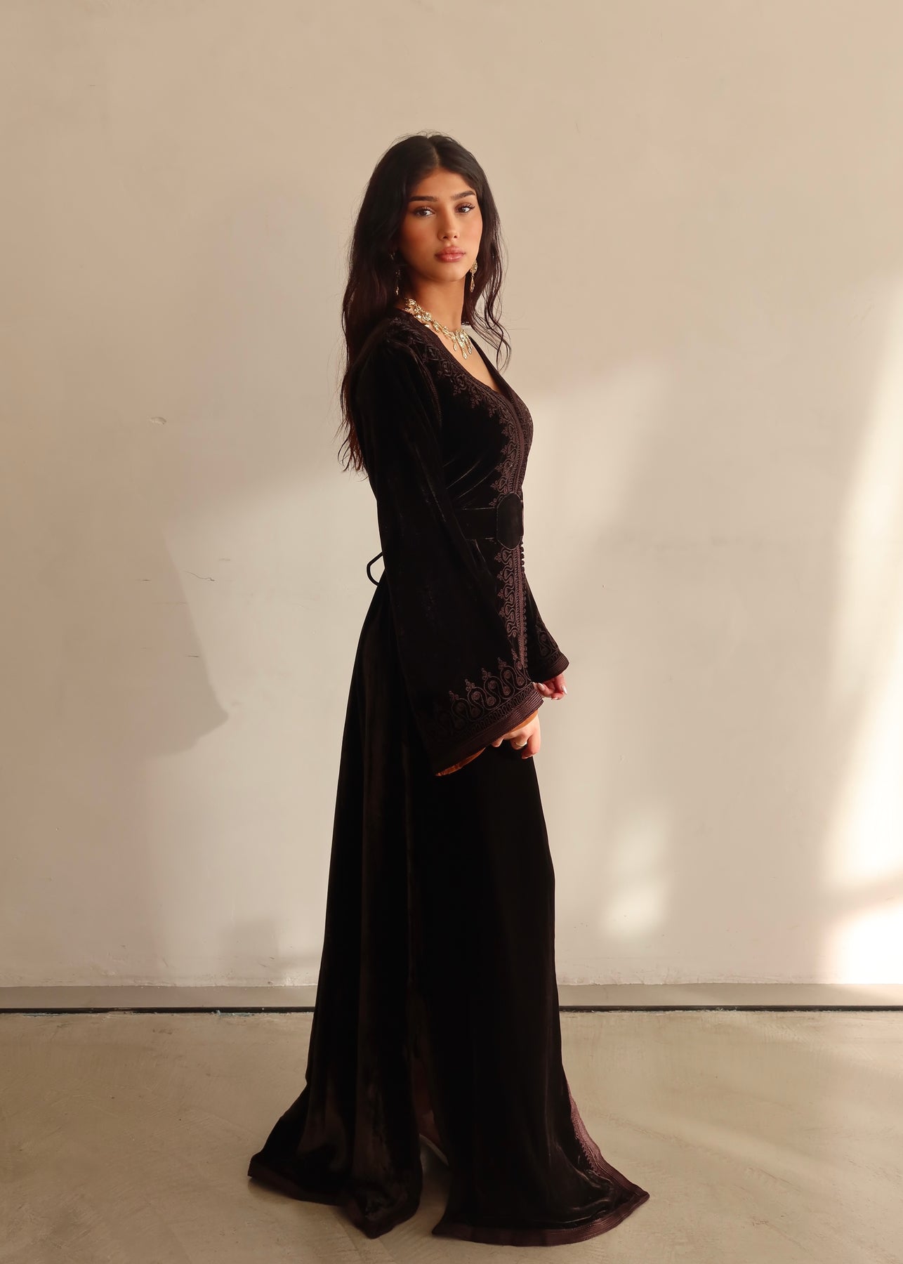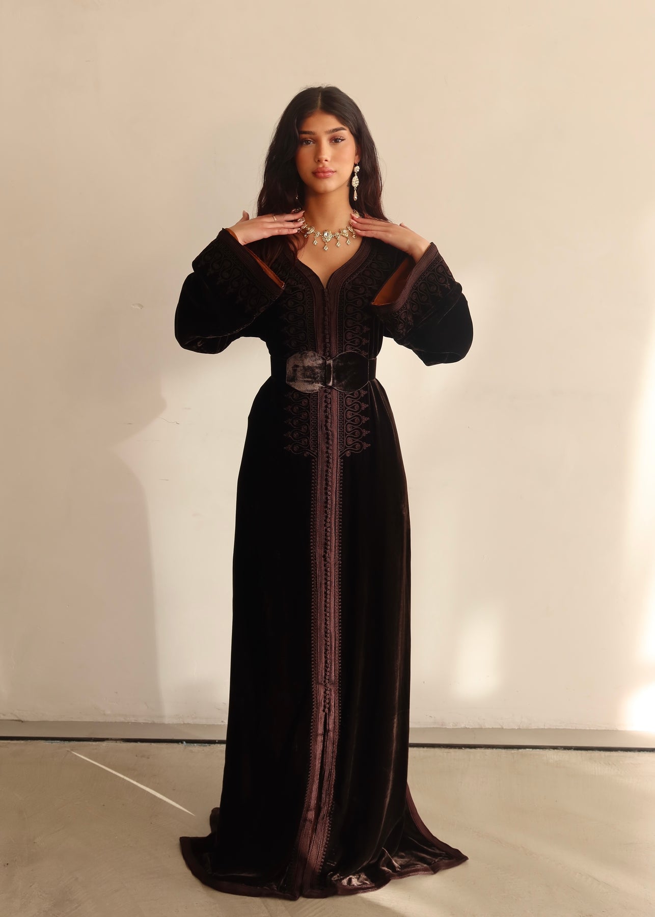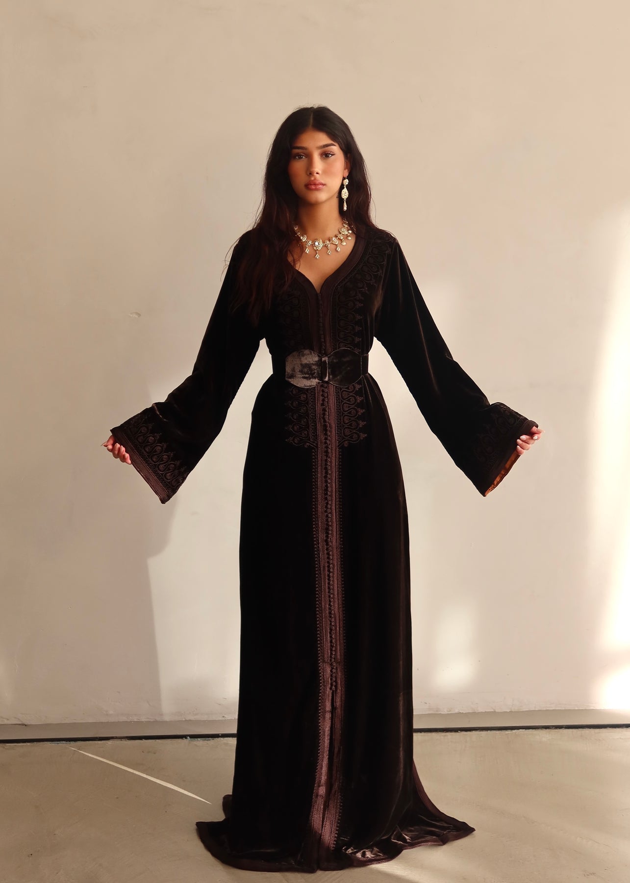 Weicher Samt, feine Stickerei & dezenter Glanz – der Velvet Kaftan ist dein Go-to für stilvolle Auftritte. Locker geschnitten, bequem & super kombinierbar.