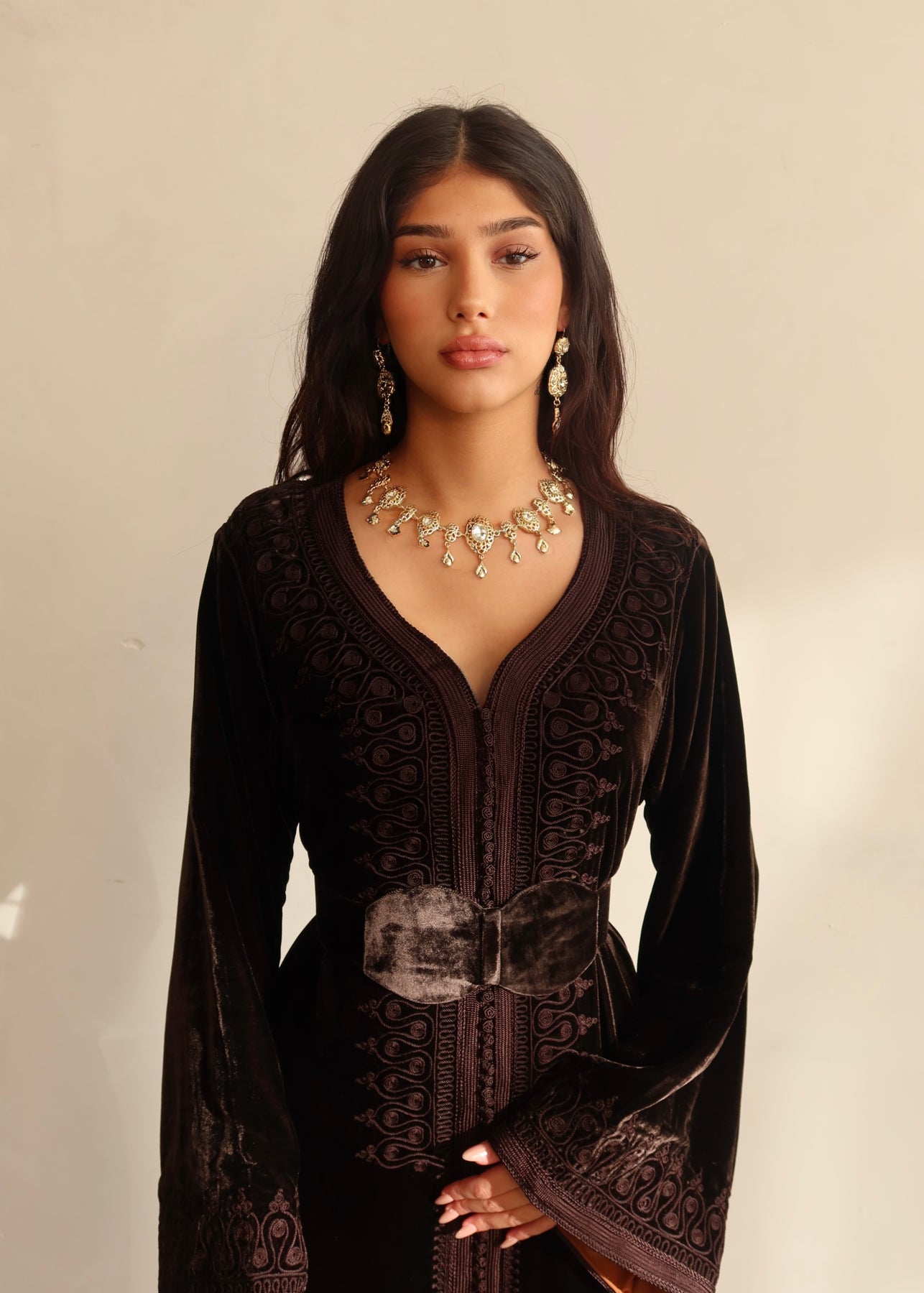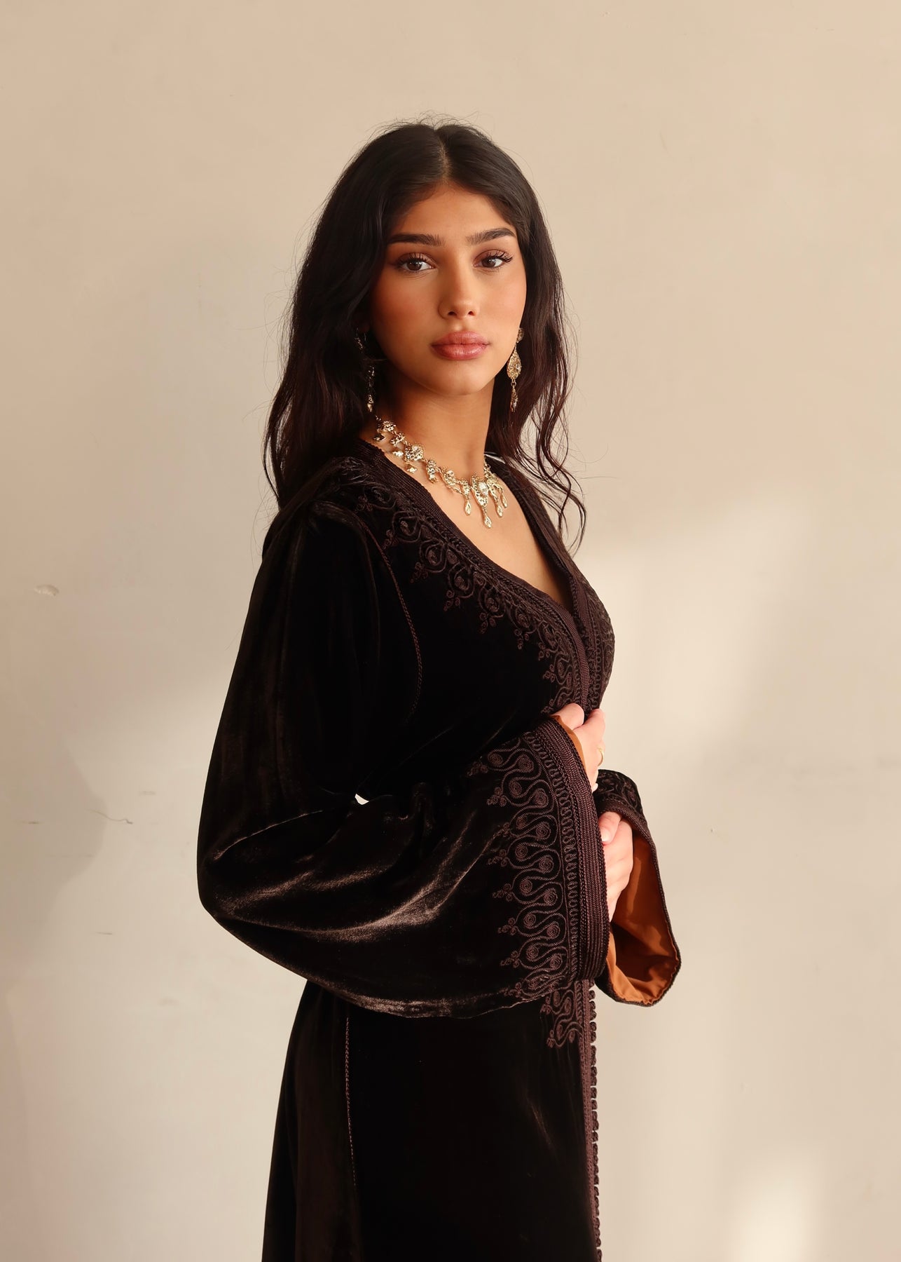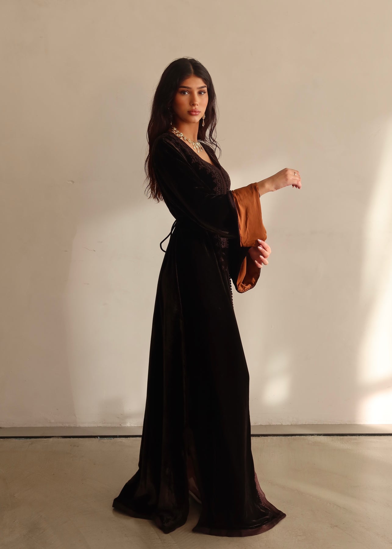 Weicher Samt, feine Stickerei & dezenter Glanz – der Velvet Kaftan ist dein Go-to für stilvolle Auftritte. Locker geschnitten, bequem & super kombinierbar.